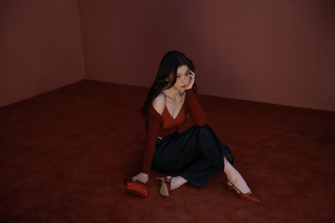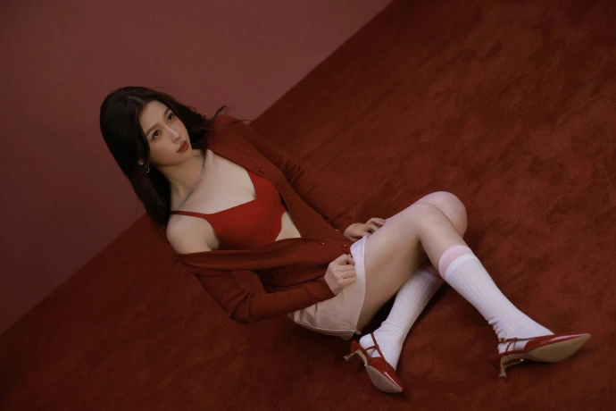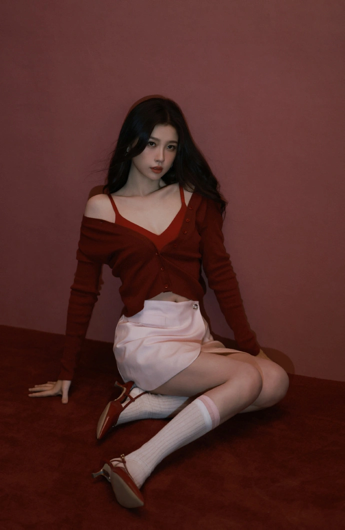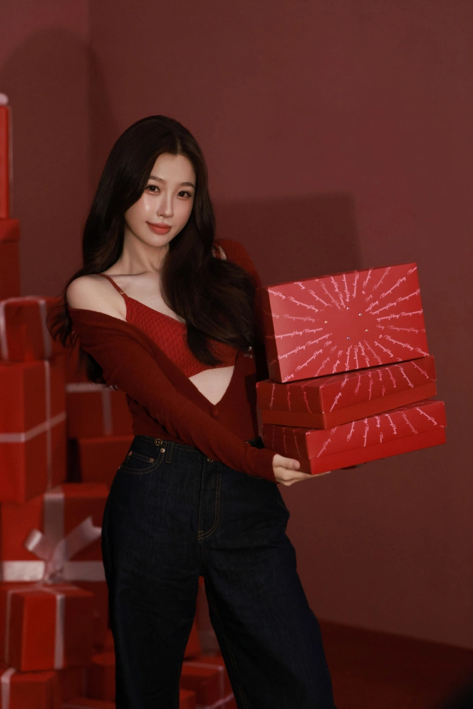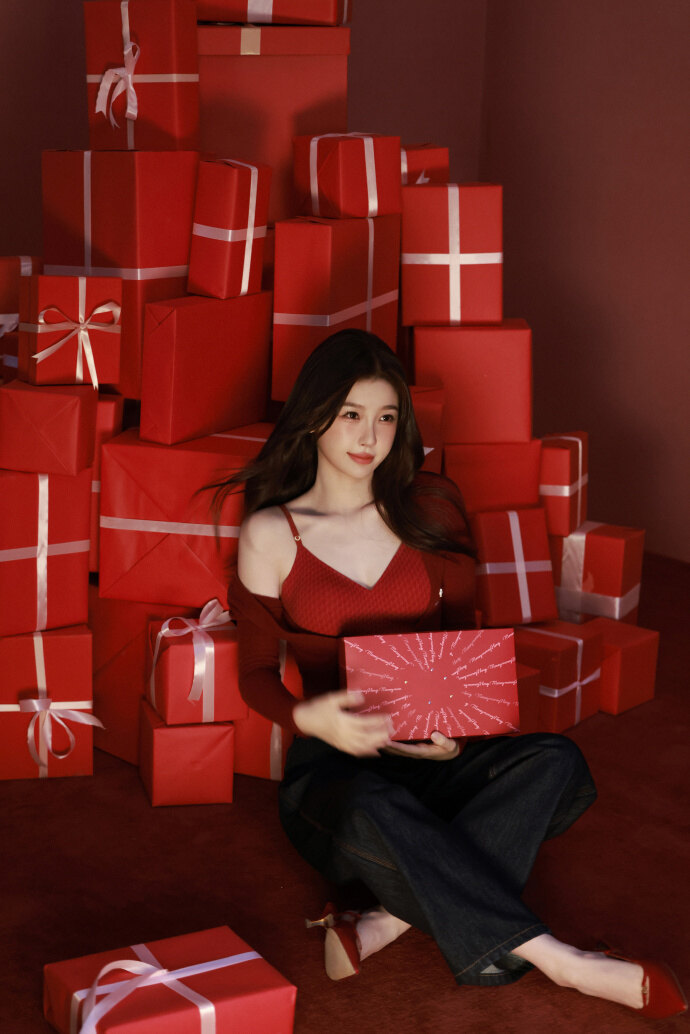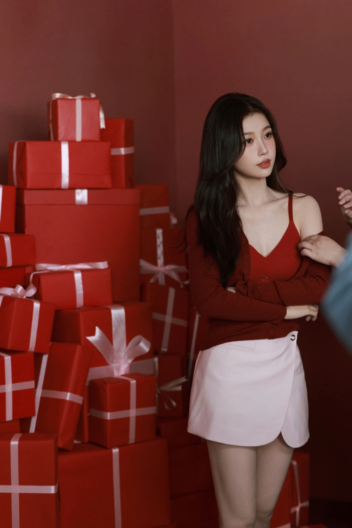镜头里,虞书欣以酒红吊带搭配同色系开衫,时而慵懒倚坐,将白袜与红鞋的复古感拉满;时而怀抱烟花纹礼盒,在堆叠的红盒间笑眼弯弯,每一个姿态都自带灵动气场。酒红与黑裤的碰撞,既衬出她的明艳大气,又藏着少女的娇俏俏皮,仿佛把新年的好运与暖意都穿在了身上。