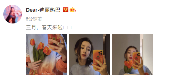 迪丽热巴晒春日对镜自拍 手捧郁金香发丝轻挽慵懒随性 全文约37字, 阅读需要1分钟 1日,迪丽热巴晒出对镜自拍,写道:“三月,春天来啦。”照片中,热巴手捧郁金香,随意挽发慵懒迷人。 1日,迪丽热巴晒出对镜自拍,写道:“三月,春天来啦。”照片中,热巴手捧郁金香,随意挽发慵懒迷人。 相关人物