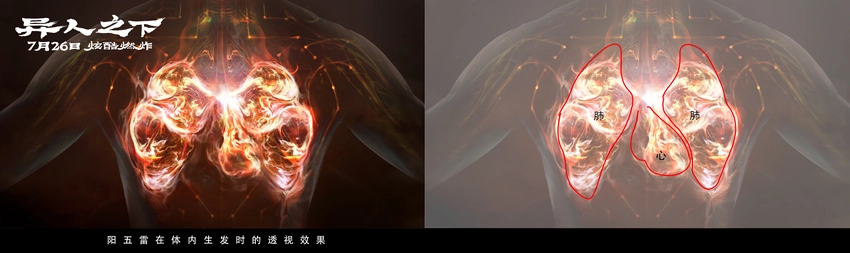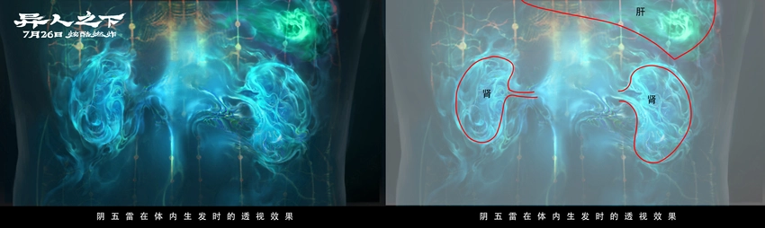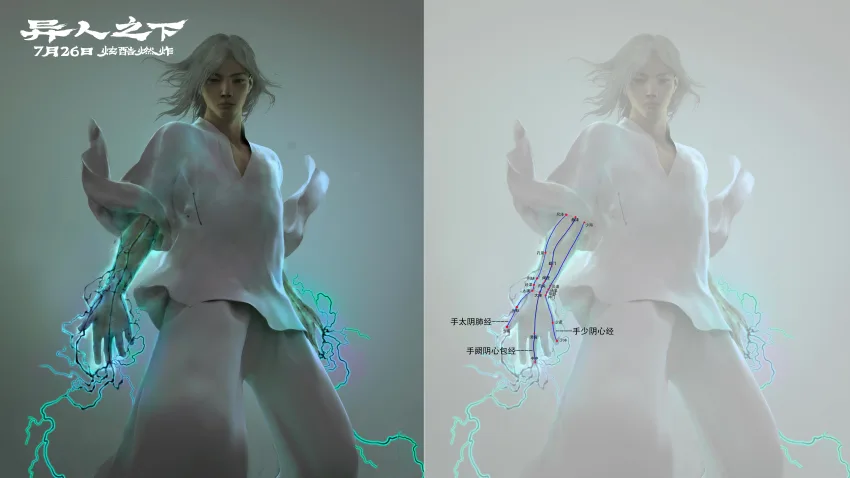除了金光术,此前预告中张楚岚和张灵玉的阴阳五雷对决也给许多观众留下了深刻的印象。除了绚丽的视效之外,雷法背后还有颇多“讲究”。影片概念设计团队也跟大家分享了阴阳五雷不同的运行原理和色彩设计。张楚岚的阳五雷来自于心肺的能量,心属火为红色、肺属金为白色,它会先从心肺的能量开始启动,然后调动到手三阳经,从穴位发出来,最终施展时呈现红色和白色。而张灵玉的阴五雷是用肝肾调动,肝属木呈蓝色、肾属水为黑色,是以手三阴经来通达全身,最终施展时呈现蓝色和黑色。虽然在改编上坚持忠于原著,但导演乌尔善也直言,“这是漫画里没有的设定,但阴阳五雷需要一个完整的逻辑。而这种启动、运行的方式,还有产生的功法的色彩,都来自于五行和经络学说”。同样引起乌尔善兴趣的,还有“雷烟炮”高宁(桑平 饰)的“十二劳情阵”的功法设定。“十二劳情阵”是通过操控人的十二经络,然后控制足厥阴肝经,让中招的人在正负两种情绪中反复挣扎,最后陷入某种极端情绪而精神崩溃。而这一精妙的设计也在电影里被“完整还原”。