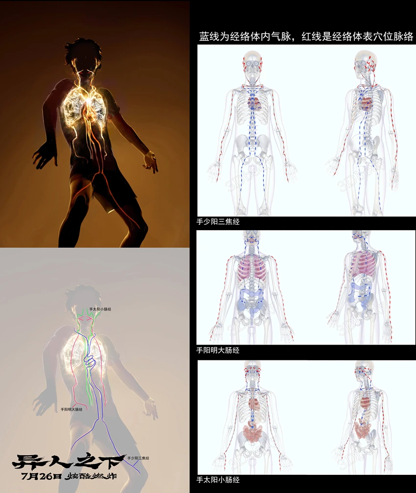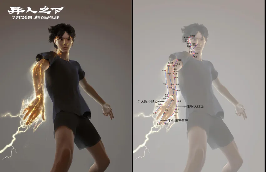 片中,每位异人所属的流派背景以及每种异能术法的底层逻辑都能在中国传统文化中追根溯源,新奇想象的背后是上千年传统文化的积淀。比如随着金光术逐渐亮起的人体穴位、最终吸收金光的印堂穴,都源自中医经络学说。不少观众在看到张楚岚施展金光术时身上的穴位逐渐被点亮的画面,直呼炫酷,“《异人之下》真的是在有效输出,让年轻人看看老祖宗的文化!”