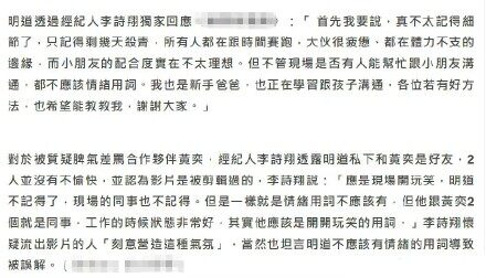 近日,明道通过经纪人回应对儿童演员爆粗口事件称:“ 首先我要说,真不太记得细节了,只记得剩几天杀青,所有人都在跟时间赛跑,大伙很疲惫、都在体力不支的边缘,而小朋友的配合度实在不太理想。但不管现场是否有人能帮忙跟小朋友沟通,都不应该情绪用词。我也是新手爸爸,也正在学习跟孩子沟通,各位若有好方法,也希望能教教我,谢谢大家。”对于被质疑脾气差骂合作伙伴黄奕,经纪人李诗翔透露明道私下和黄奕是好友,并没有不愉快,