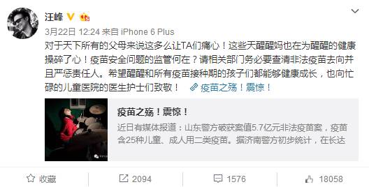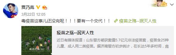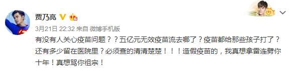 汪峰微博原文输果然是天下父母最操心啊!甜馨爸爸贾乃亮,这次一改往日幽默亲切的风格,意外爆粗口大骂那些卖假疫苗的人