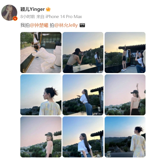 套娃式拍照!颖儿晒自己拍的钟楚曦拍林允 三美女互拍超养眼 全文约35字, 阅读需要1分钟 7月18日,颖儿晒自己拍的钟楚曦拍林允,“我拍@钟楚曦 拍@林允Jelly ”,照片中三美女互拍超级养眼。 7月18日,颖儿晒自己拍的钟楚曦拍林允,“我拍@钟楚曦 拍@林允Jelly ”,照片中三美女互拍超级养眼。 相关人物