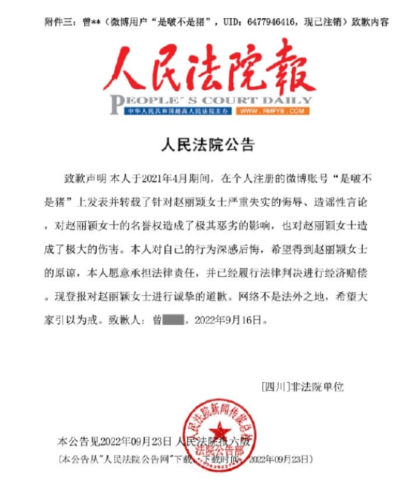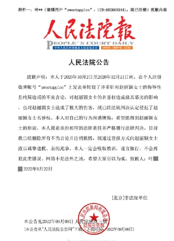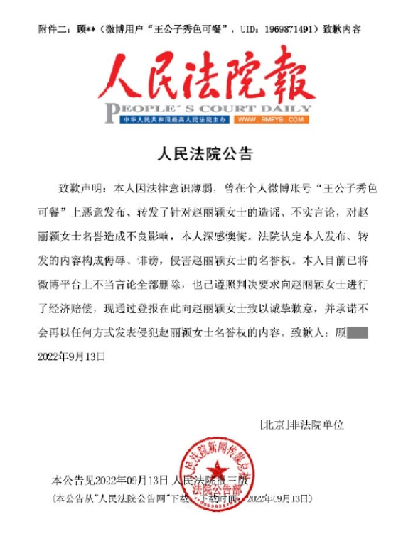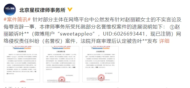 23日,北京星權律師事務所發表趙麗穎名譽維權案件的進展説明。三位用户分別於9月8日、13日、23日在《人民法院報》公開發布致歉內容,並已向趙麗穎全額支付案件賠償款。