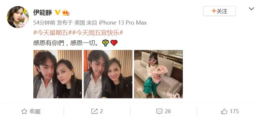 久之娛樂訊 11月24日是感恩節,北京時間25日,伊能靜微博曬照,她與兒子哈利頭靠頭合影,另外一張照片中,女兒米粒手捧鮮花笑容燦爛。