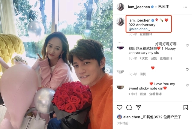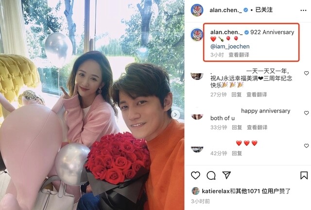 陳喬恩艾倫慶相愛三週年 獲送玫瑰花和包包陳喬恩開心比耶 全文约89字, 阅读需要1分钟 昨天Alan還分享過陳喬恩獨自出鏡的視頻,他為妻子陳喬恩准備了玫瑰花和包包,陳喬恩開心比耶滿臉洋溢幸福。 23日凌晨,陳喬恩和丈夫Alan同時分享合影,慶祝兩人相愛三週年,他們發表了相同的文案“922Anniversary”,並且艾特了彼此的名字。昨天Alan還分享過陳喬恩獨自出鏡的視頻,他為妻子陳喬恩准備了玫瑰花和包包,陳喬恩開心比耶滿臉洋溢幸福。 相關人物