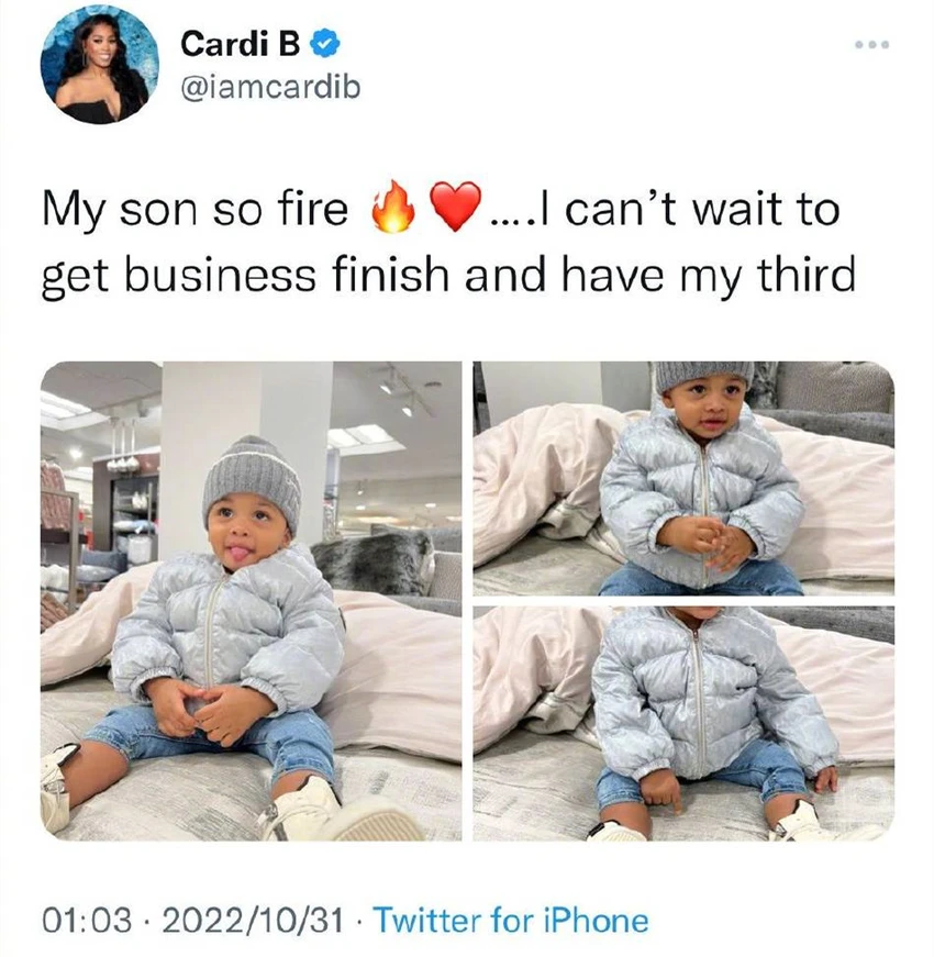 Cardi B曬兒子可愛吐舌照 直言迫不及待想生三胎 全文约59字, 阅读需要1分钟 久之娛樂訊 10月31日,Cardi B在個人社交平台上分享了一組兒子Wave的可愛照片,並表示迫不及待想結束工作生三胎。照片中的小Wave頭戴毛線帽,吐舌頭十分可愛。 久之娛樂訊 10月31日,Cardi B在個人社交平台上分享了一組兒子Wave的可愛照片,並表示迫不及待想結束工作生三胎。照片中的小Wave頭戴毛線帽,吐舌頭十分可愛。 相關人物