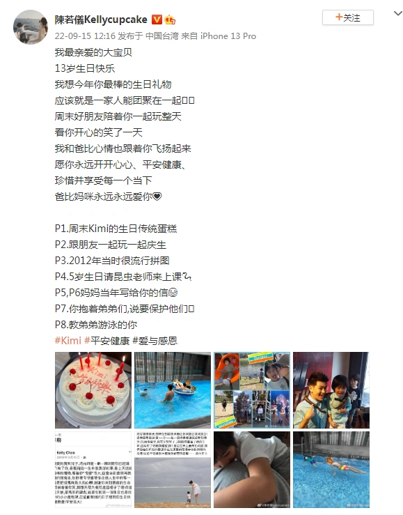 9月15日,陳若儀曬照為大兒子kimi慶生,“我最親愛的大寶貝,13歲生日快樂。願你永遠開開心心、平安健康、珍惜並享受每一個當下”。