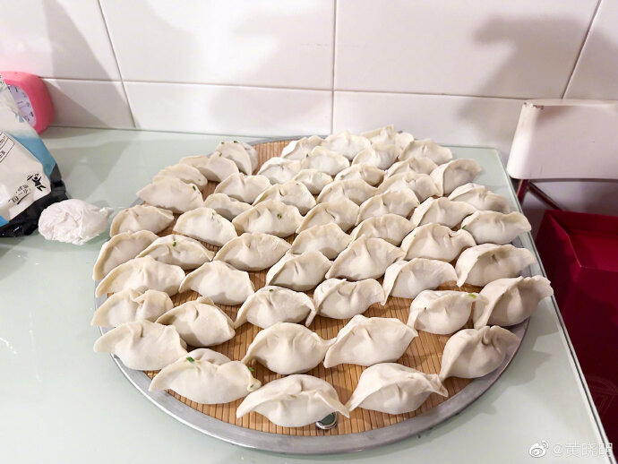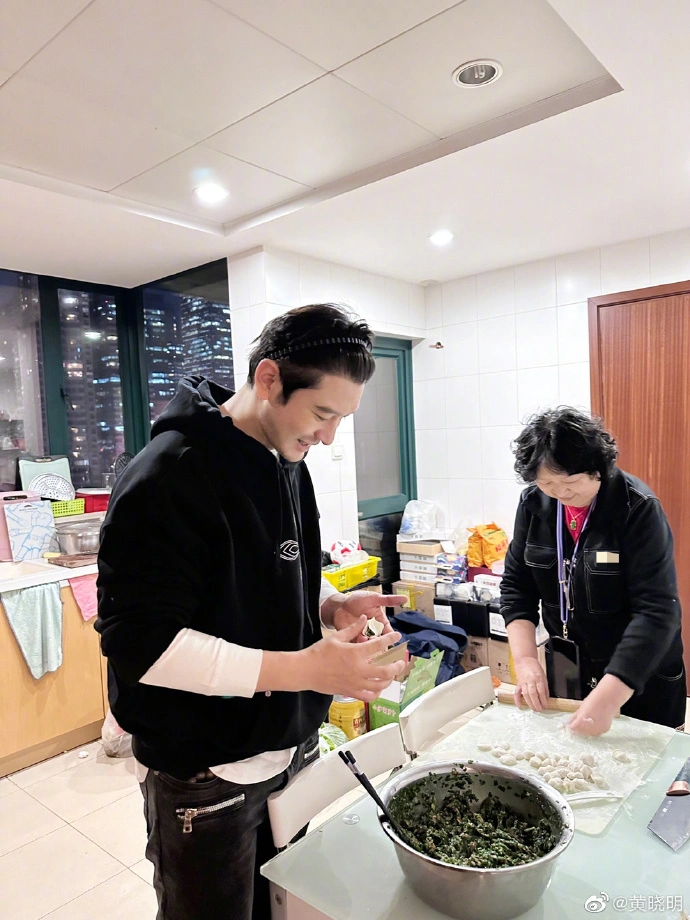 22日,黃曉明曬出與家人、同事一起包餃子的照片,兒子小海綿也出鏡,擀餃子皮有模有樣,祖孫三代合影其樂融融。