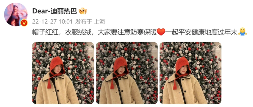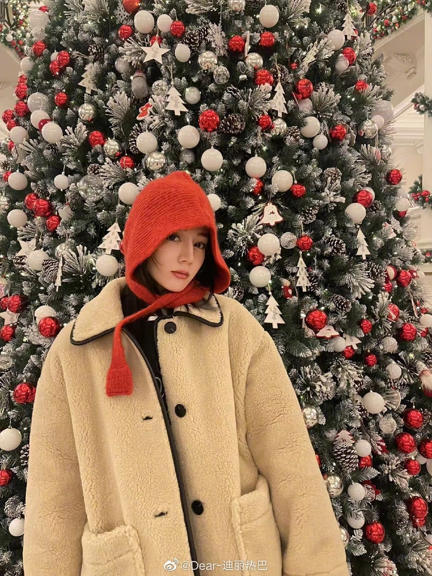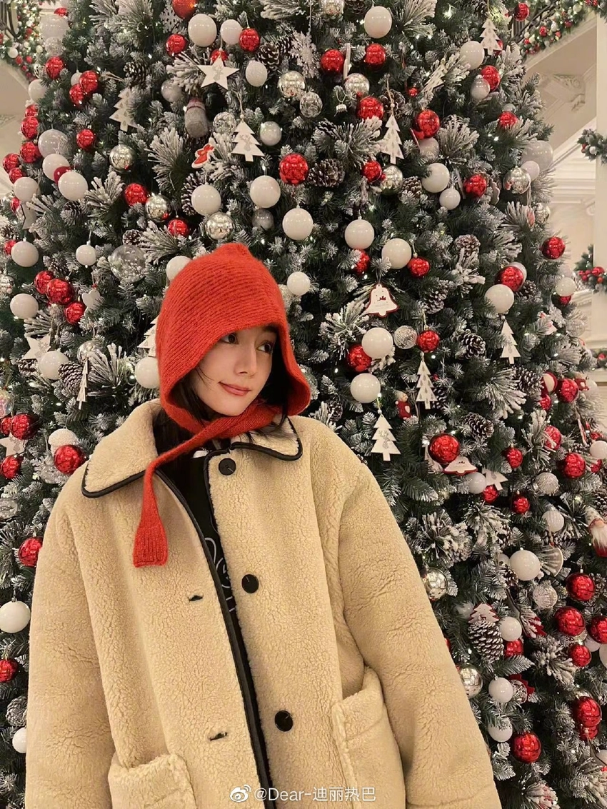 27日,迪麗熱巴曬紅帽子隨拍,“帽子紅紅,衣服絨絨,大家要注意防寒保暖,一起平安健康地度過年末。”照片中迪麗熱巴戴毛絨小紅帽與聖誕樹合影可可愛愛。