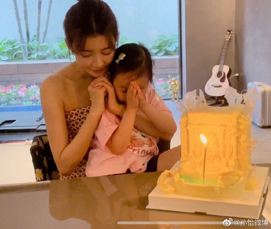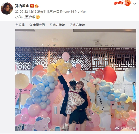 22日,孫怡曬照為女兒慶祝五歲生日,照片中她抱起大福開心對鏡比耶,配文:“小孩兒五歲啦!”