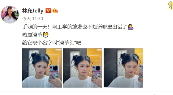 林允分享自學編髮成果調侃是“潦草頭” 對鏡wink俏皮可愛 全文约77字, 阅读需要1分钟 久之娛樂訊 10月31日,林允分享三宮格自拍,配文:“手殘的一天!網上學的編髮也不知道哪裏出錯了略顯潦草,給它取個名字叫‘潦草頭’吧。”照片中,她扎着雙丸子頭造型可愛減齡,對鏡賣萌很是俏皮。 久之娛樂訊 10月31日,林允分享三宮格自拍,配文:“手殘的一天!網上學的編髮也不知道哪裏出錯了略顯潦草,給它取個名字叫‘潦草頭’吧。”照片中,她扎着雙丸子頭造型可愛減齡,對鏡賣萌很是俏皮。 相關人物