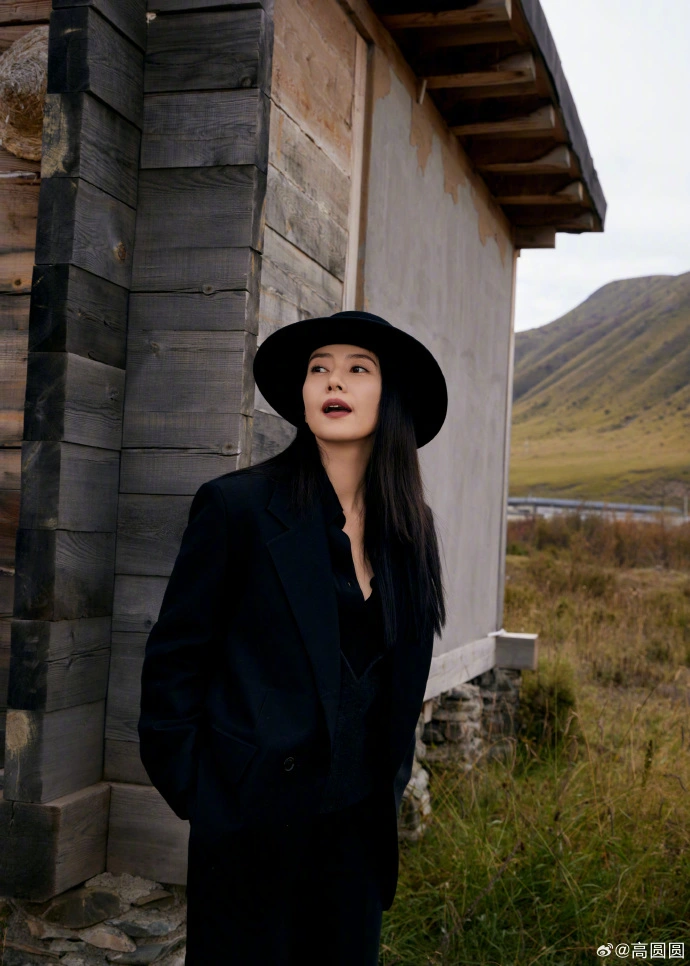 近日高圓圓曬一襲黑色休閒西裝照,幹練優雅太美。