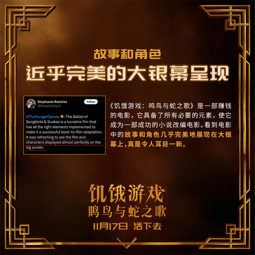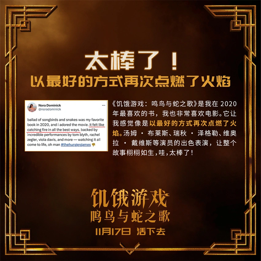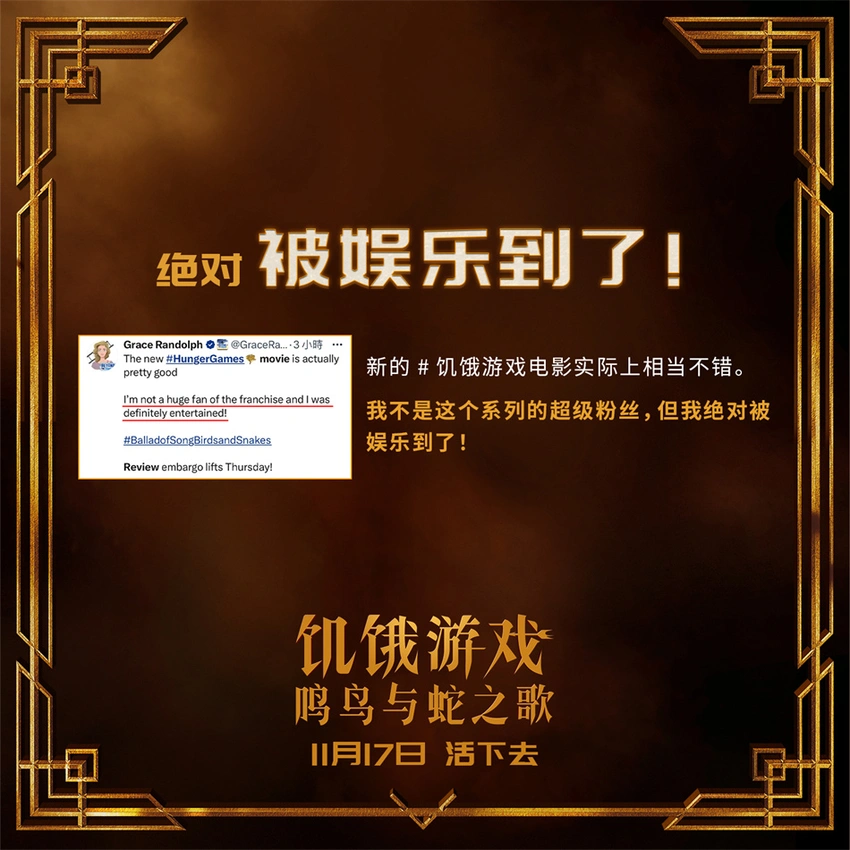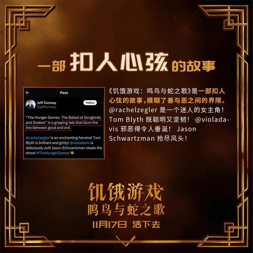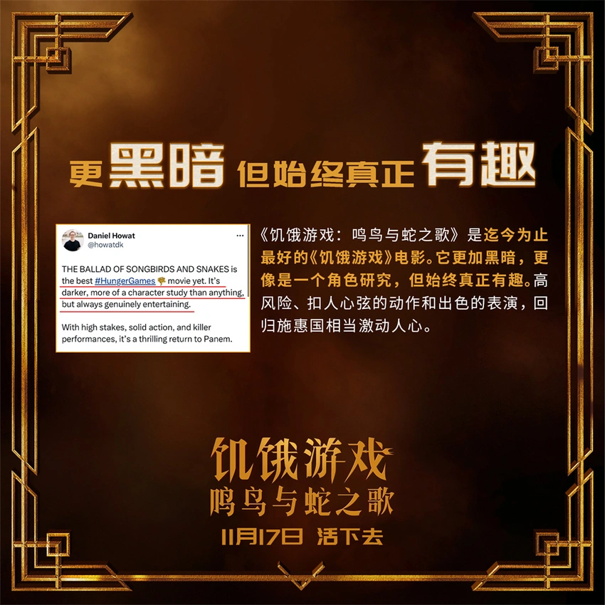 電影《飢餓遊戲:鳴鳥與蛇之歌》再現經典真人大逃生!殘酷暴虐的死亡競技遊戲,眾人入局後卻**“只能活一個”的無情遊戲規則,以及男主角斯諾在人性考驗前、善惡搖擺間所作出的抉擇,無一不為觀眾們帶來了前所未有的極致觀影體驗,“狠無人性”的爽感挑戰令眾多海外網友在柏林首映後大呼過癮,紛紛第一時間給予好評:“《飢餓遊戲:鳴鳥與蛇之歌》具備了所有必要的元素,使它成為一部成功的小說改編電影。看到電影中的故事和角色幾乎完美地展現在大銀幕上,真是令人耳目一新。”“《飢餓遊戲:鳴鳥與蛇之歌》非常好。對於遊戲的描寫非常出色,真實地捕捉到了未來版本中更加殘酷的競爭和更加激烈的場面。”“《飢餓遊戲:鳴鳥與蛇之歌》是一部扣人心絃的故事,模糊了善與惡之間的界限。”