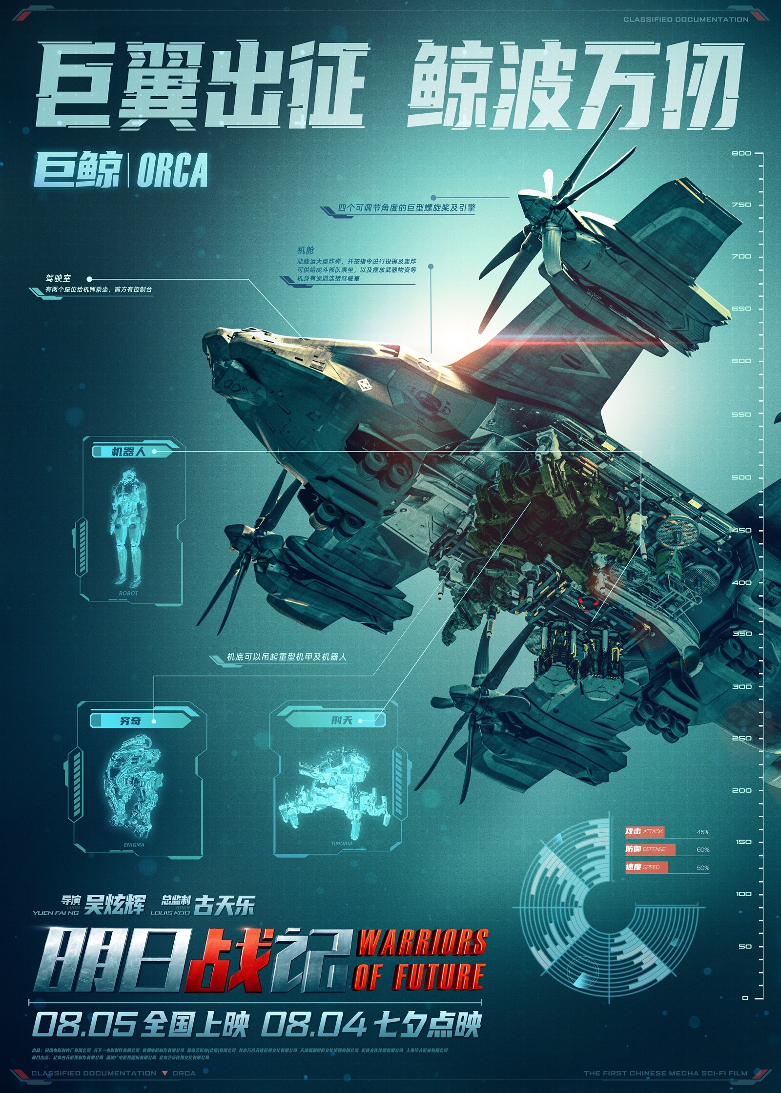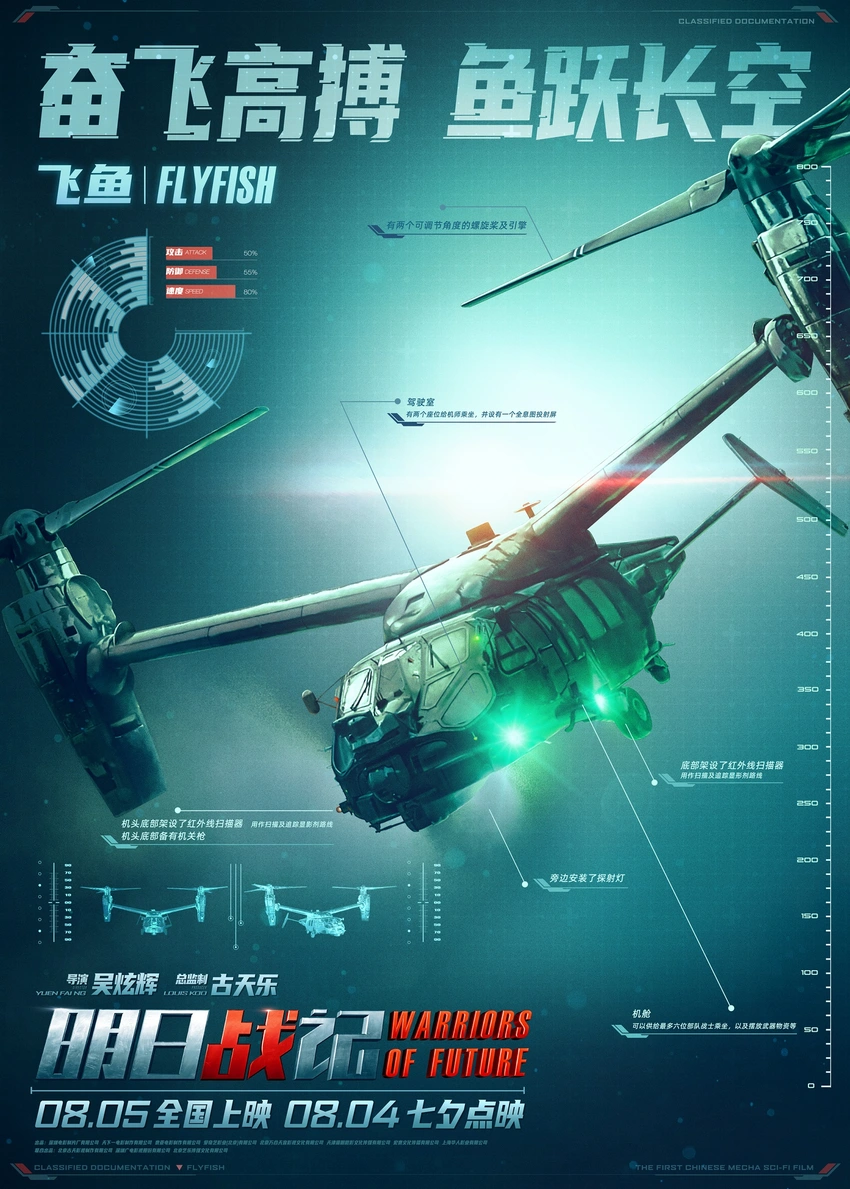 中國式浪漫是每一個國人所特有的情懷,而在本部影片中也得以展現。今天,影片釋出的“機甲狂潮”版海報暗藏玄機,刑天、窮奇、機器人、巨鯨、飛魚、重灌甲等未來戰場上的幾大殺手鐧一一亮相,它們的攻擊力、防禦力、敏捷度與精準度數值強大,可見這場末日決戰危機重重。同時兩大具有頂級殺傷力的機甲名字皆出自上古神話,海報上的文字也極具國潮風,“威刑肅物,震天動地”、“窮工極巧,奇兵制勝”將傳統文化與未來科技相結合,把中國式硬核浪漫展現得淋漓盡致。